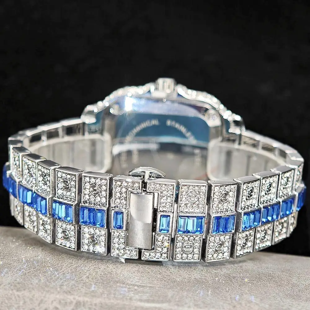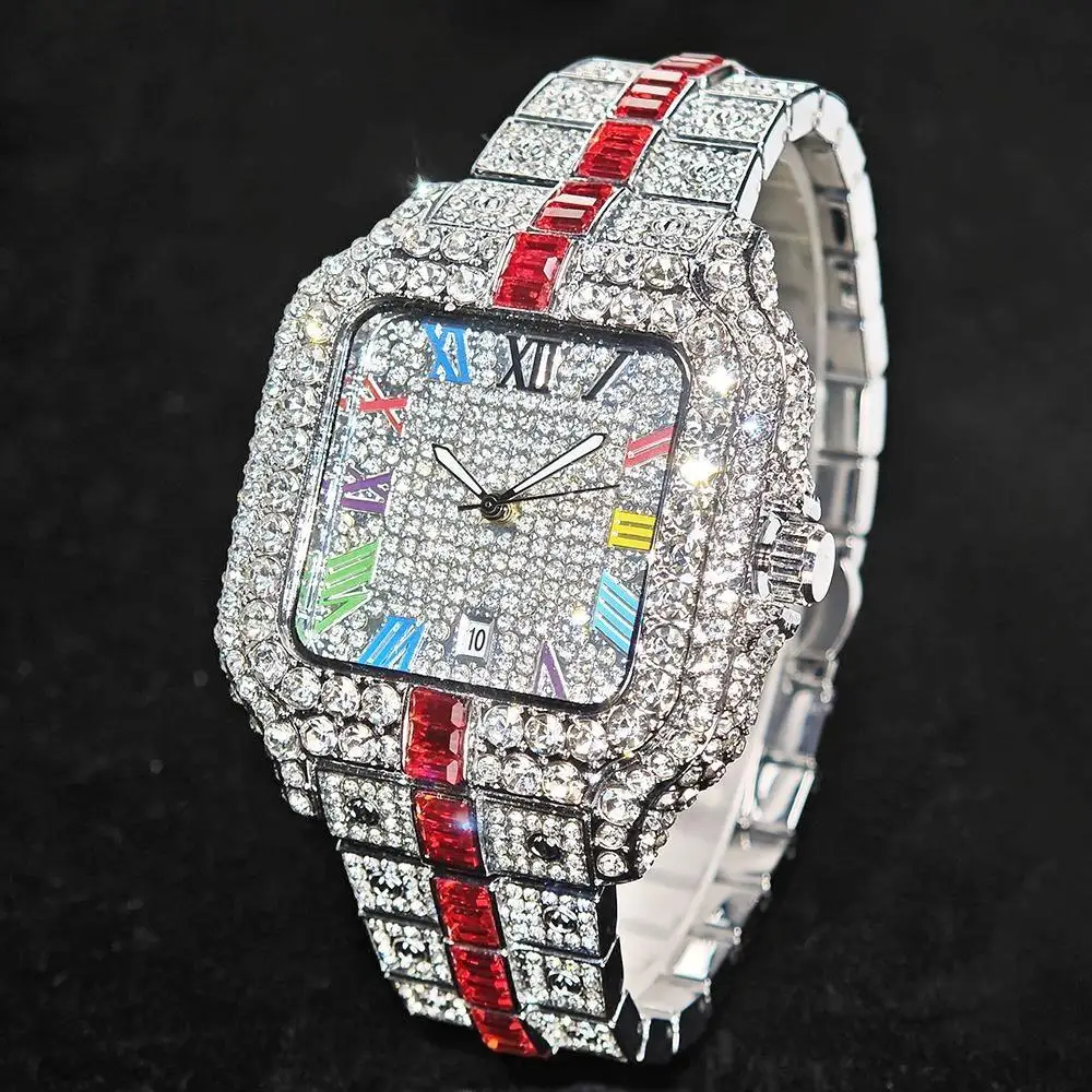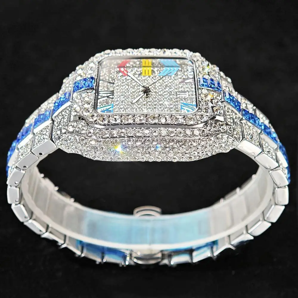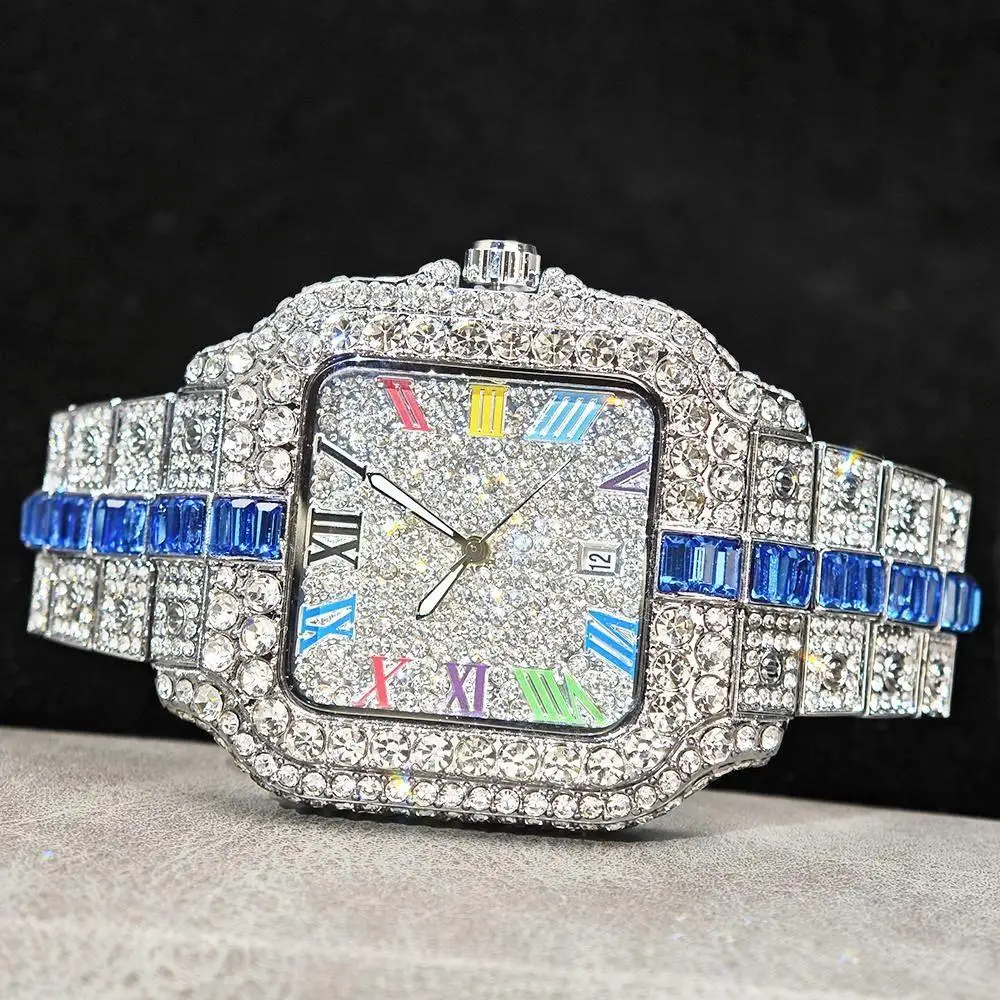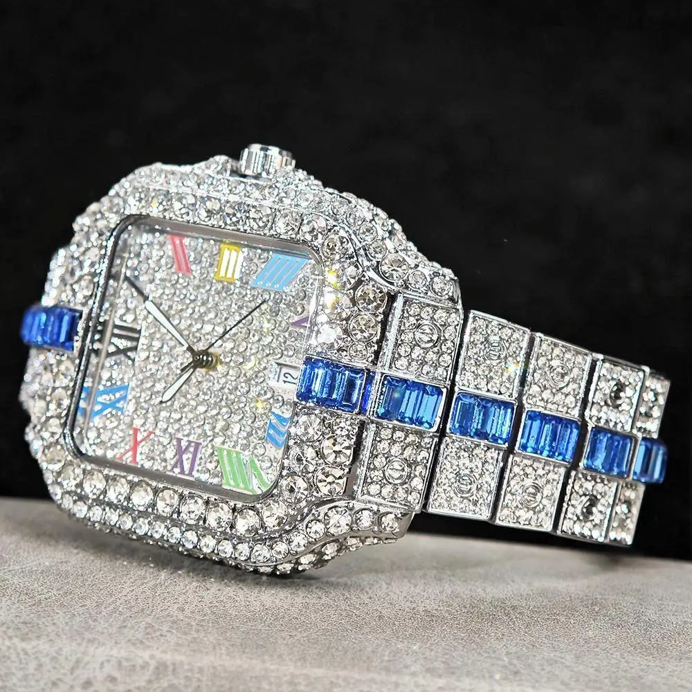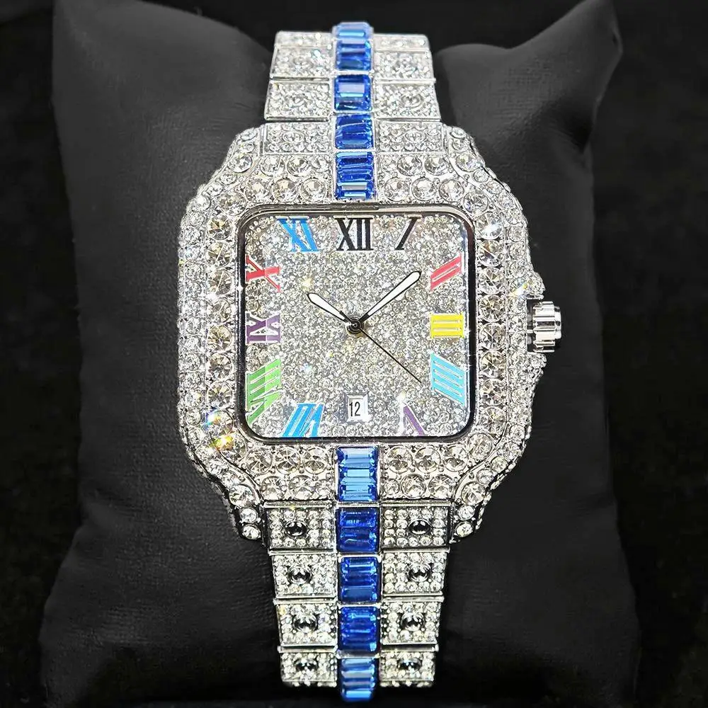 Hot Sale Blue Iced Watch For Man Fashion Colorful Roman Literal Quartz Watch Hip Hop Diamond Jewelry Square Wrist Watch Men Gift