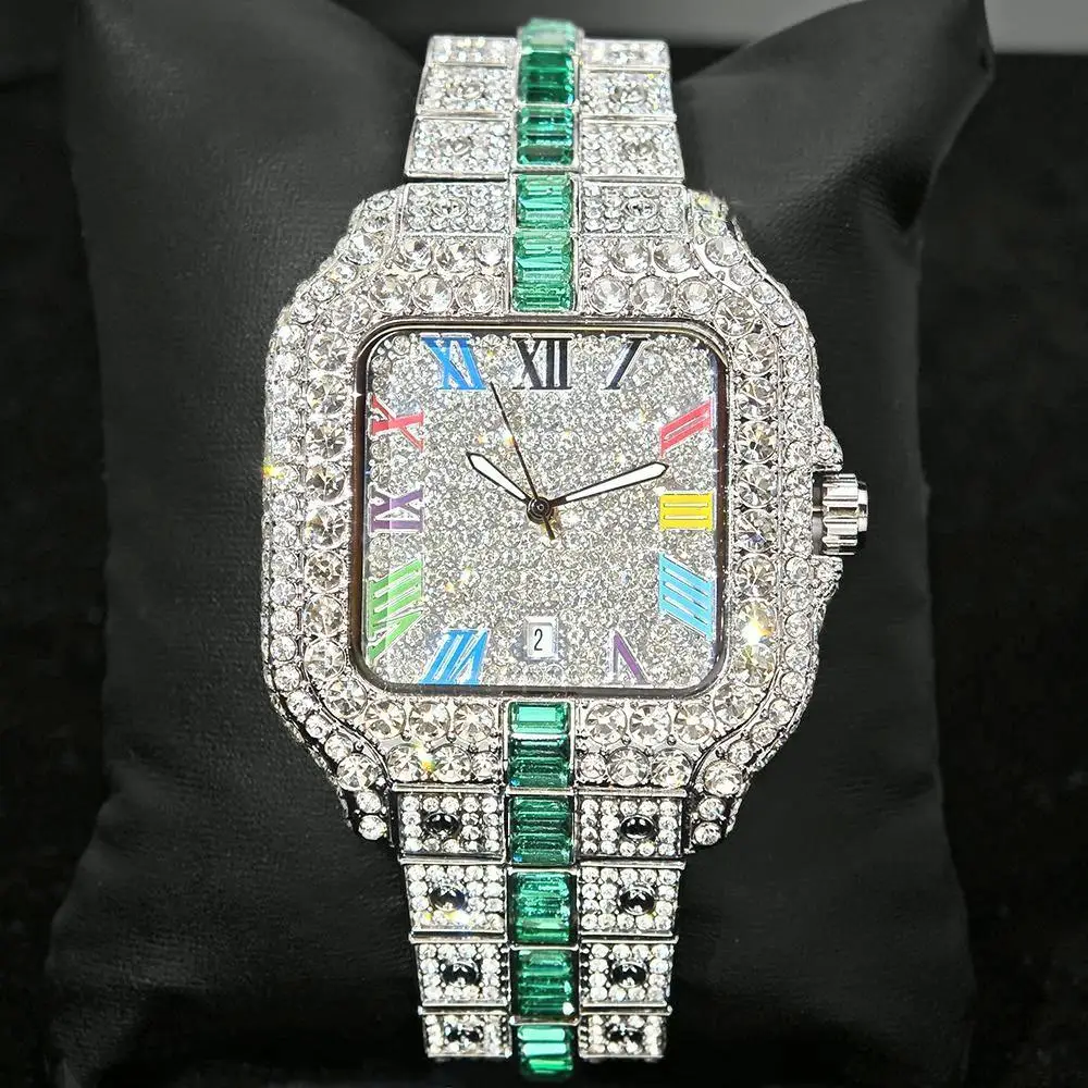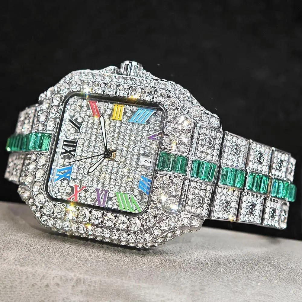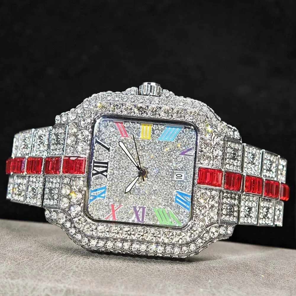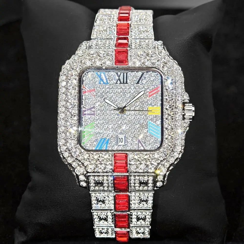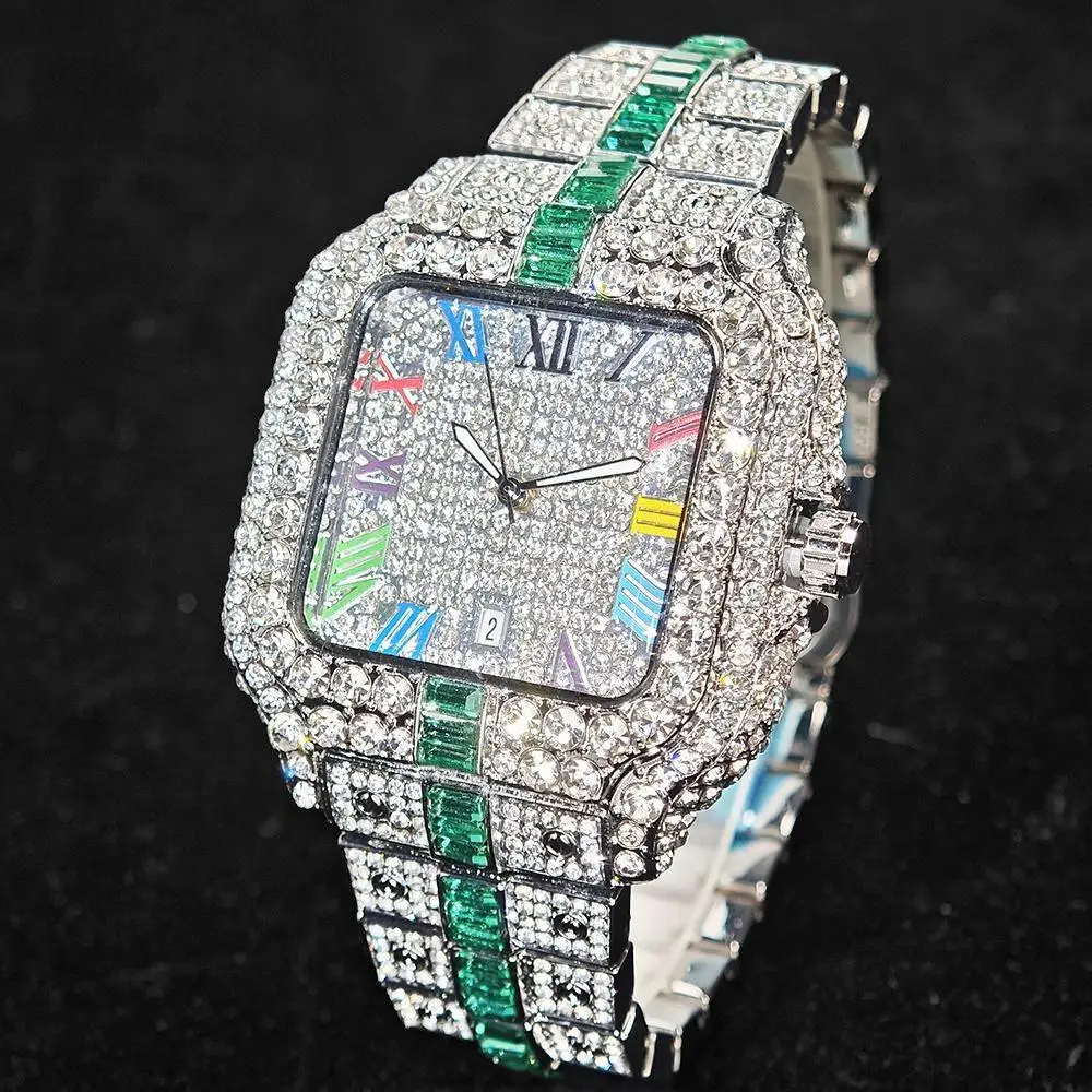 Hot Sale Blue Iced Watch For Man Fashion Colorful Roman Literal Quartz Watch Hip Hop Diamond Jewelry Square Wrist Watch Men Gift