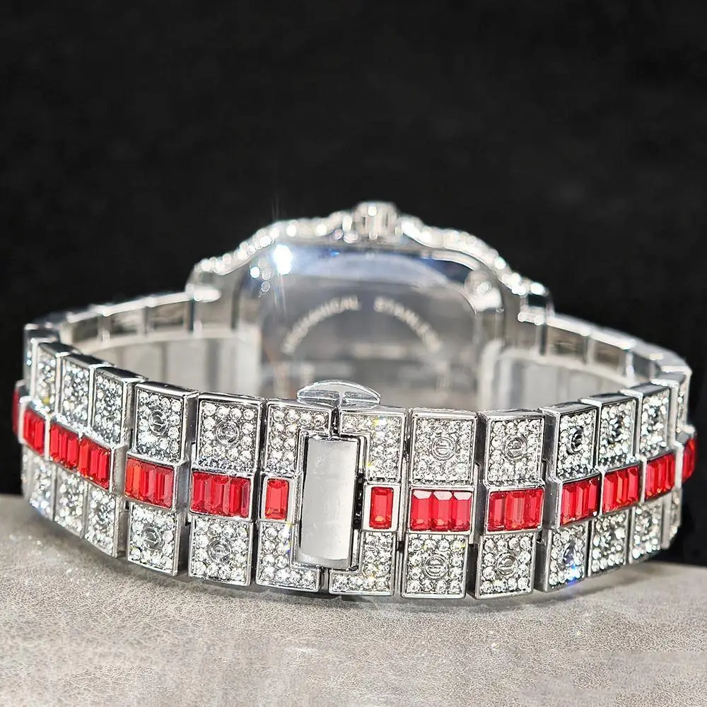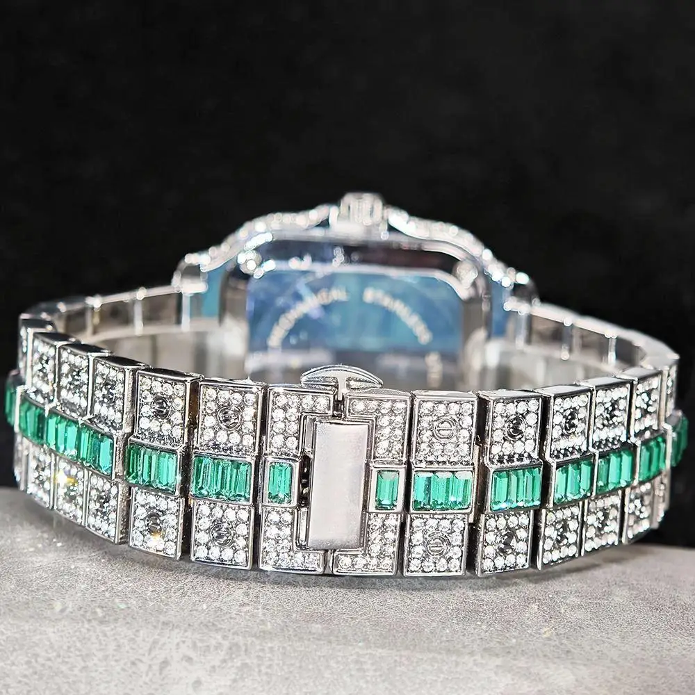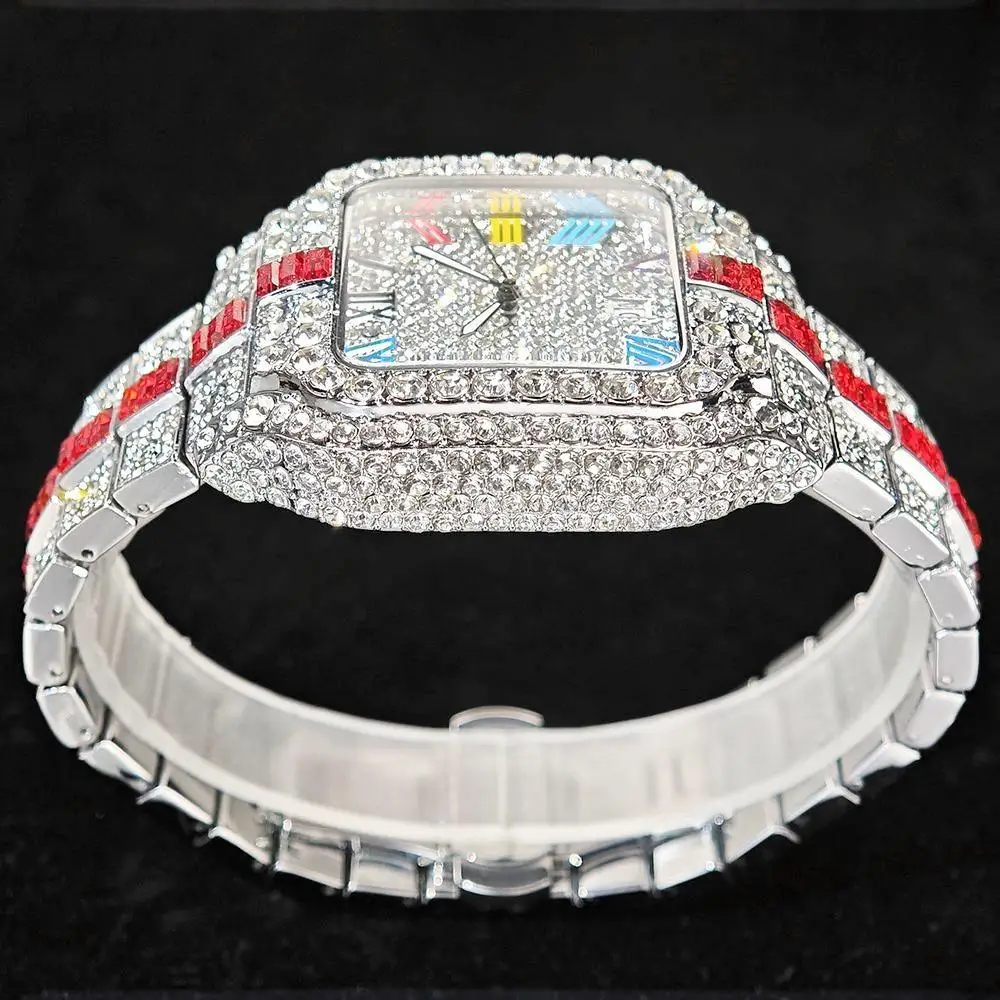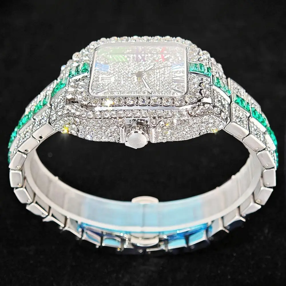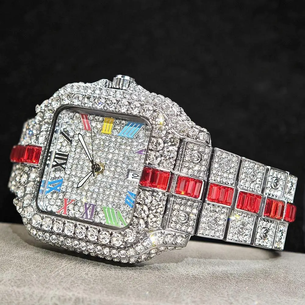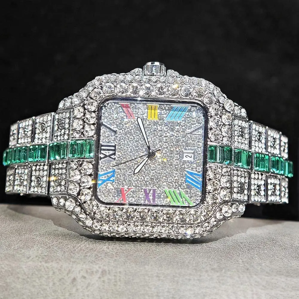 Hot Sale Blue Iced Watch For Man Fashion Colorful Roman Literal Quartz Watch Hip Hop Diamond Jewelry Square Wrist Watch Men Gift