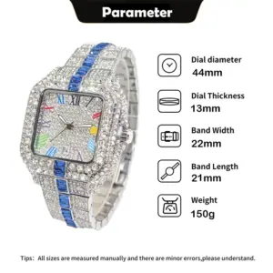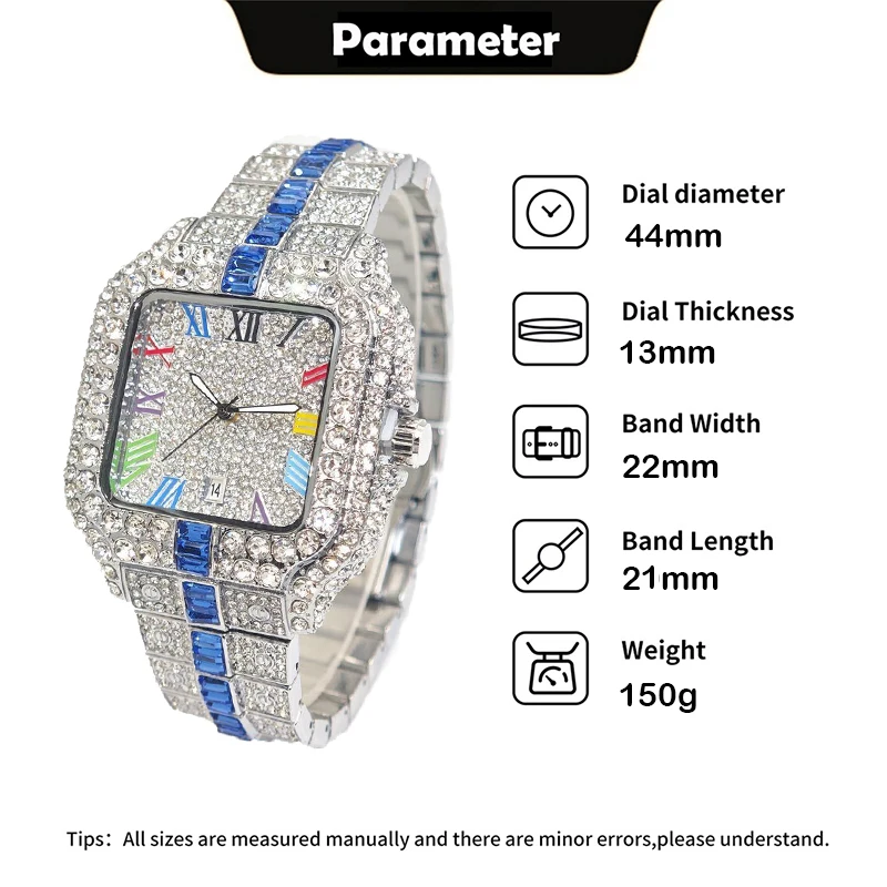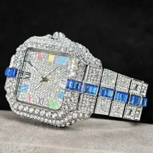 Be the first to review “Hot Sale Blue Iced Watch For Man Fashion Colorful Roman Literal Quartz Watch Hip Hop Diamond Jewelry Square Wrist Watch Men Gift”
