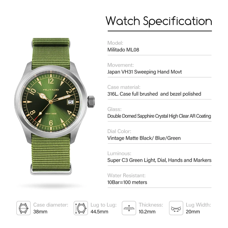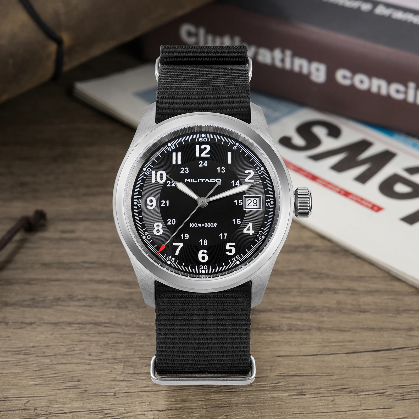 Militado ML08 빈티지 석영 시계 론다 515 운동 Ar 사파이어 거울 38mm 손목 시계 날짜 슈퍼 밝은 방수 시계