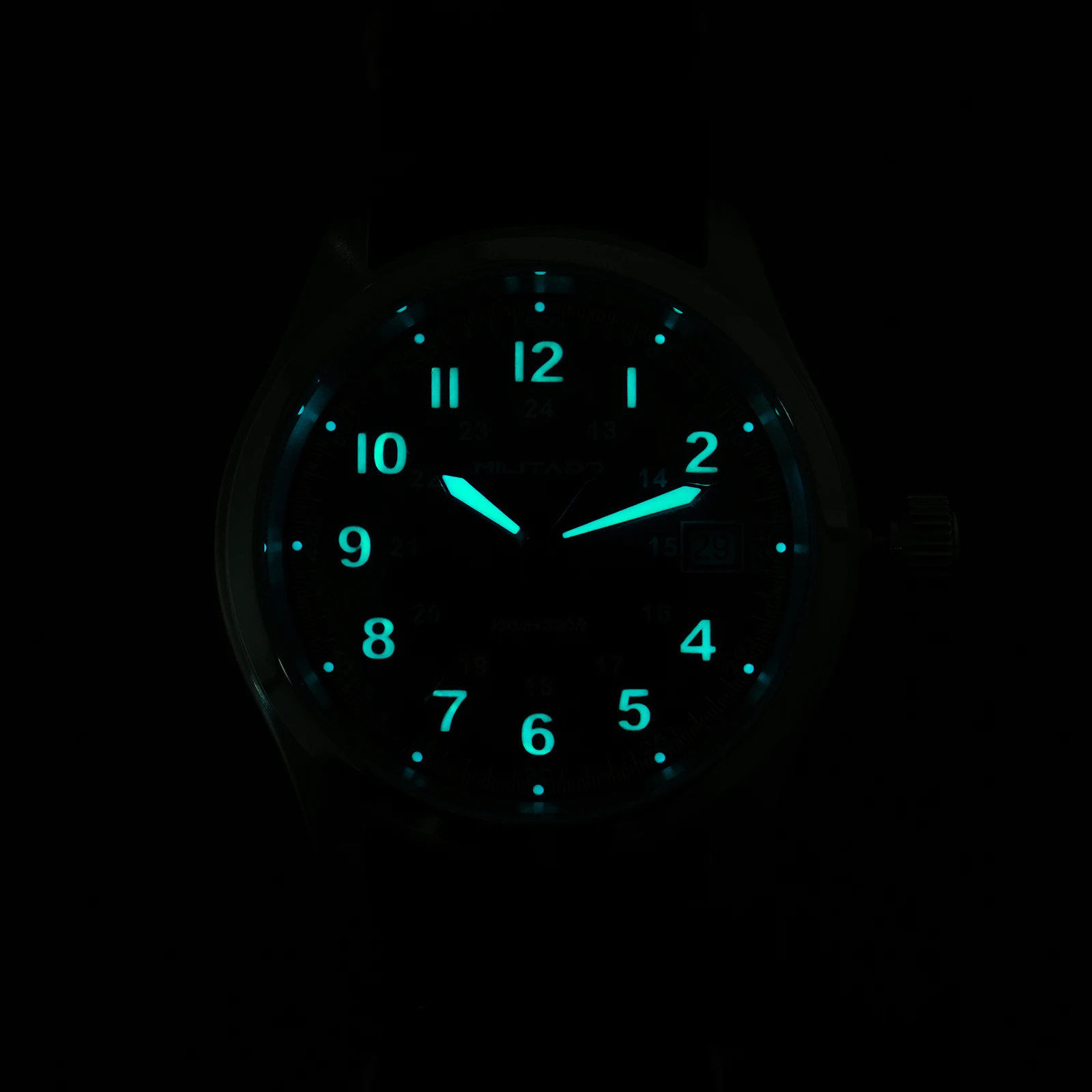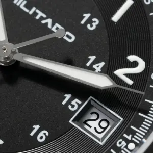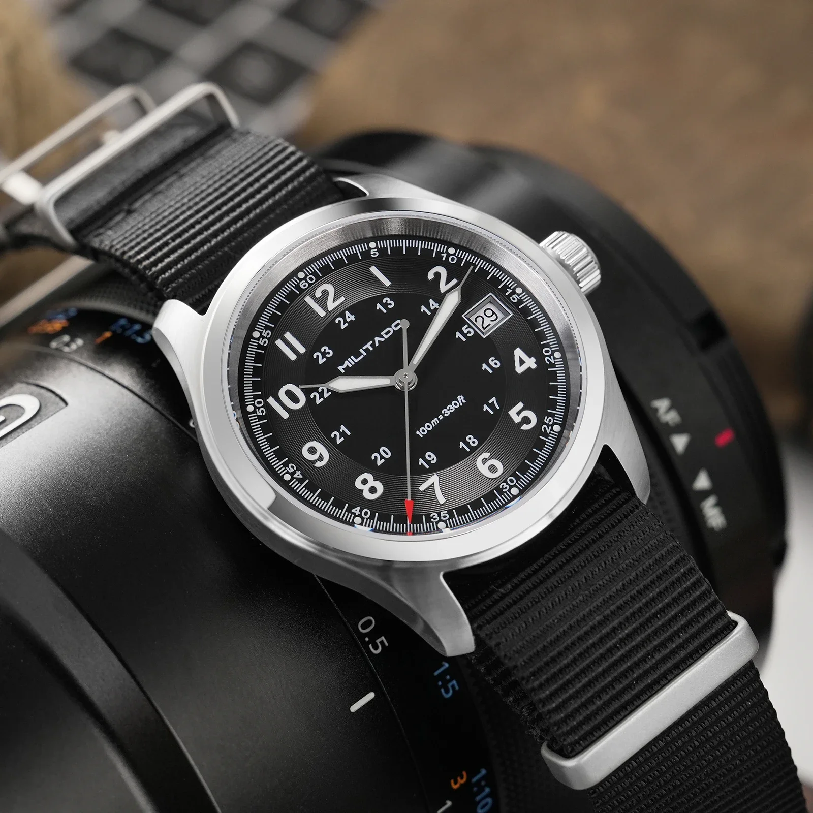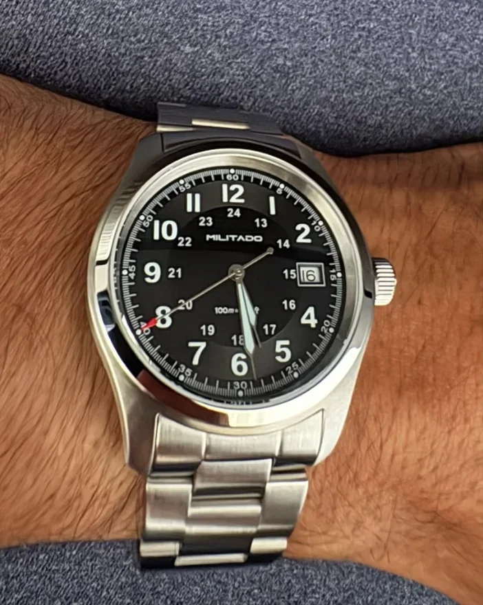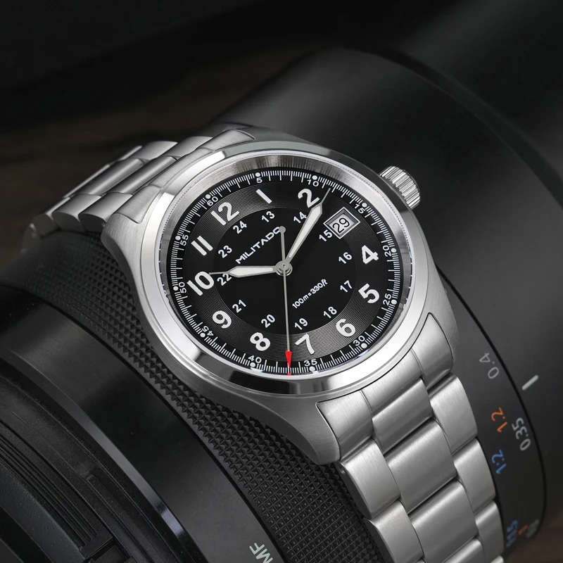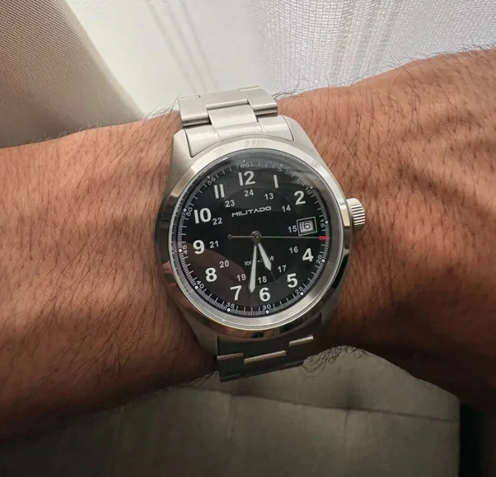 This copy of the Hamilton watch is nearly identical and has many features I prefer. It’s 100m water-resistant, has a screw-down crown, and is a quartz watch. I’ve grown tired of adjusting the time on mechanical watches due to their inaccuracy and difficulty in resetting after long periods of inactivity. This watch offers a better and more practical option. The numbers have excellent finishing, unlike the product photos that show them as rough. So they should remove that photo as it’s not an accurate representation of the high quality finishing I received. The bezel is high-polished, and the rest of the watch is brushed. The strap is of high quality with fine micro-adjustments for a perfect fit. Overall, there’s nothing negative to say. It also looks great in a NATO strap as the metal band it comes with! I’ve already swam in it, and I can say it is in fact waterproof. Highly recommended!