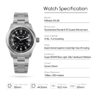 Be the first to review “Militado ML08 Vintage Quartz Watch Ronda 515 Movement Ar Sapphire Mirror 38Mm Wrist Watch Date Super Luminous Waterproof Watches”