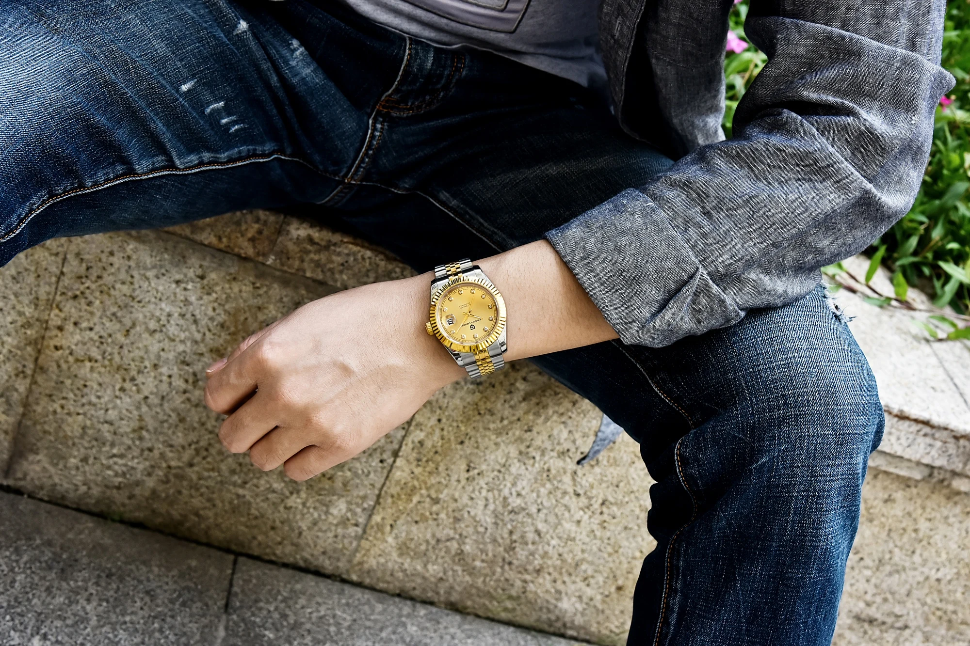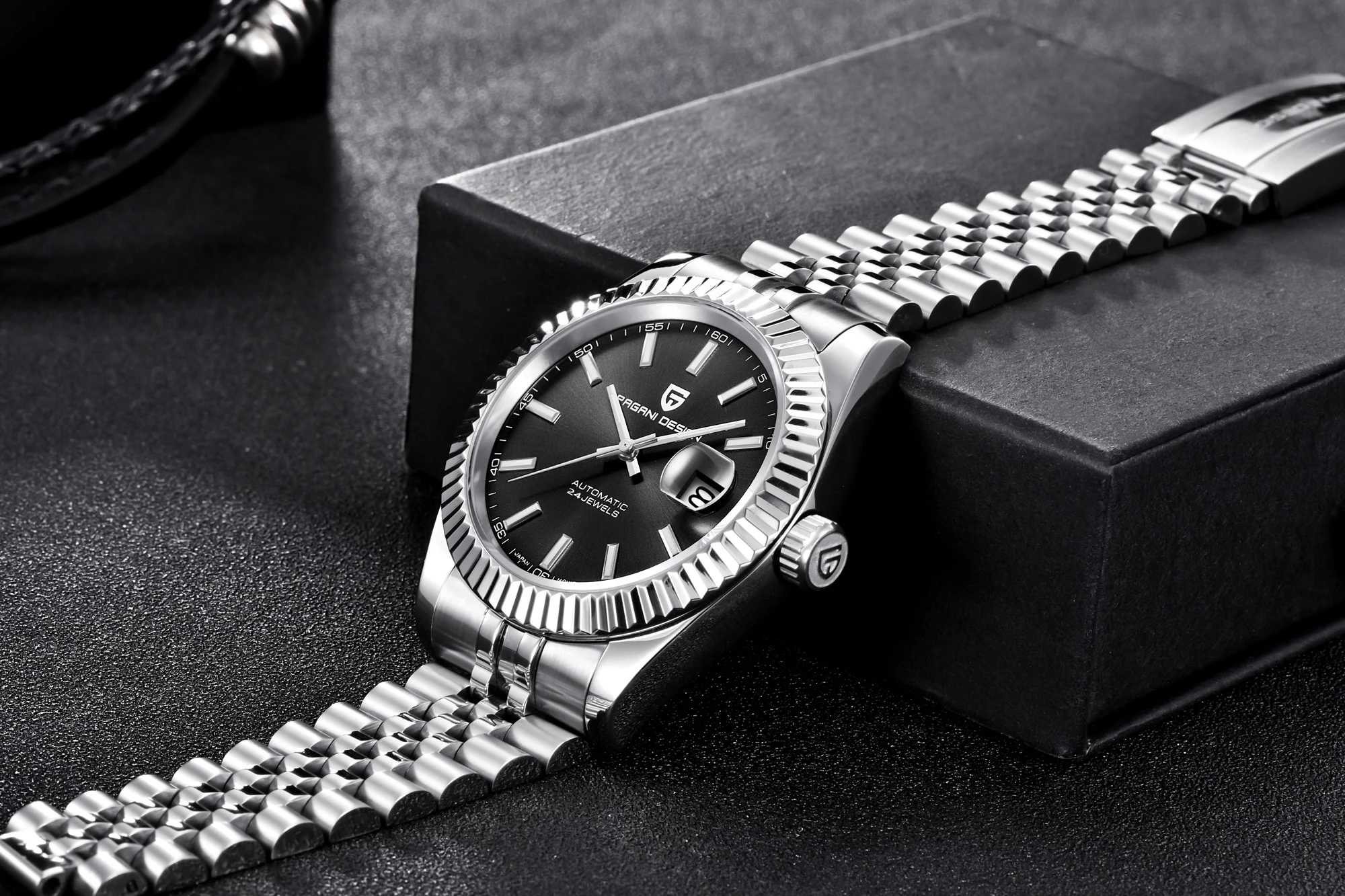 Secure your timepiece with ease using the folding clasp with safety feature, ensuring your watch stays firmly in place.
